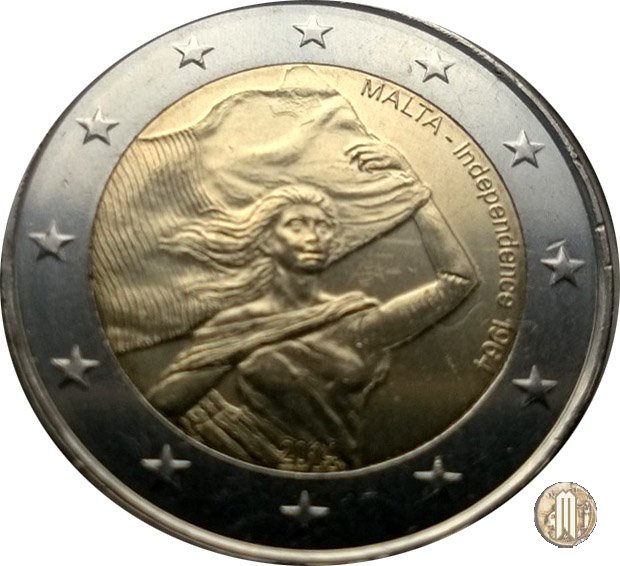 2 Euro 2014 Indipendenza di Malta (1964) Dritto: Il dritto della moneta rappresenta un dettaglio del monumento in bronzo che celebra l’indipendenza, opera del 1989 dell’artista Gianni Bonnici. La giovane donna raffigurata rappresenta Malta e sventola la bandiera maltese. A destra è riportata l’iscrizione “MALTA - Independence 1964” e in basso l’anno di emissione “2014”. Sulla corona esterna le 12 stelle dell’Unione europea. E la quarta di una pentaserie che commemora eventi importanti nella storia costituzionale di Malta. |