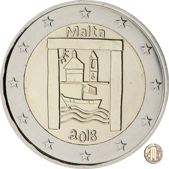 2 Euro 2018 - Bambini e solidarietà Dritto: Il disegno, opera di uno scolaro, raffigura una serie di motivi caratteristici del patrimonio culturale maltese. Si possono notare un riferimento ai templi preistorici, che sono le piú antiche strutture autoportanti al mondo, la cupola e il campanile di una chiesa, elementi architettonici tipici delle città e dei villaggi maltesi, e la rappresentazione di una barca tradizionale maltese con la bandiera del paese. Nella parte superiore del disco interno della moneta è riportato il nome del paese di emissione, “Malta”, mentre in esergo compare l’anno “2018”. Autore: Nicole Dimech, studente alla scuola secondaria. Sulla corona esterna compaiono le 12 stelle dell’Unione europea. Verso: Faccia comune |