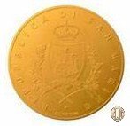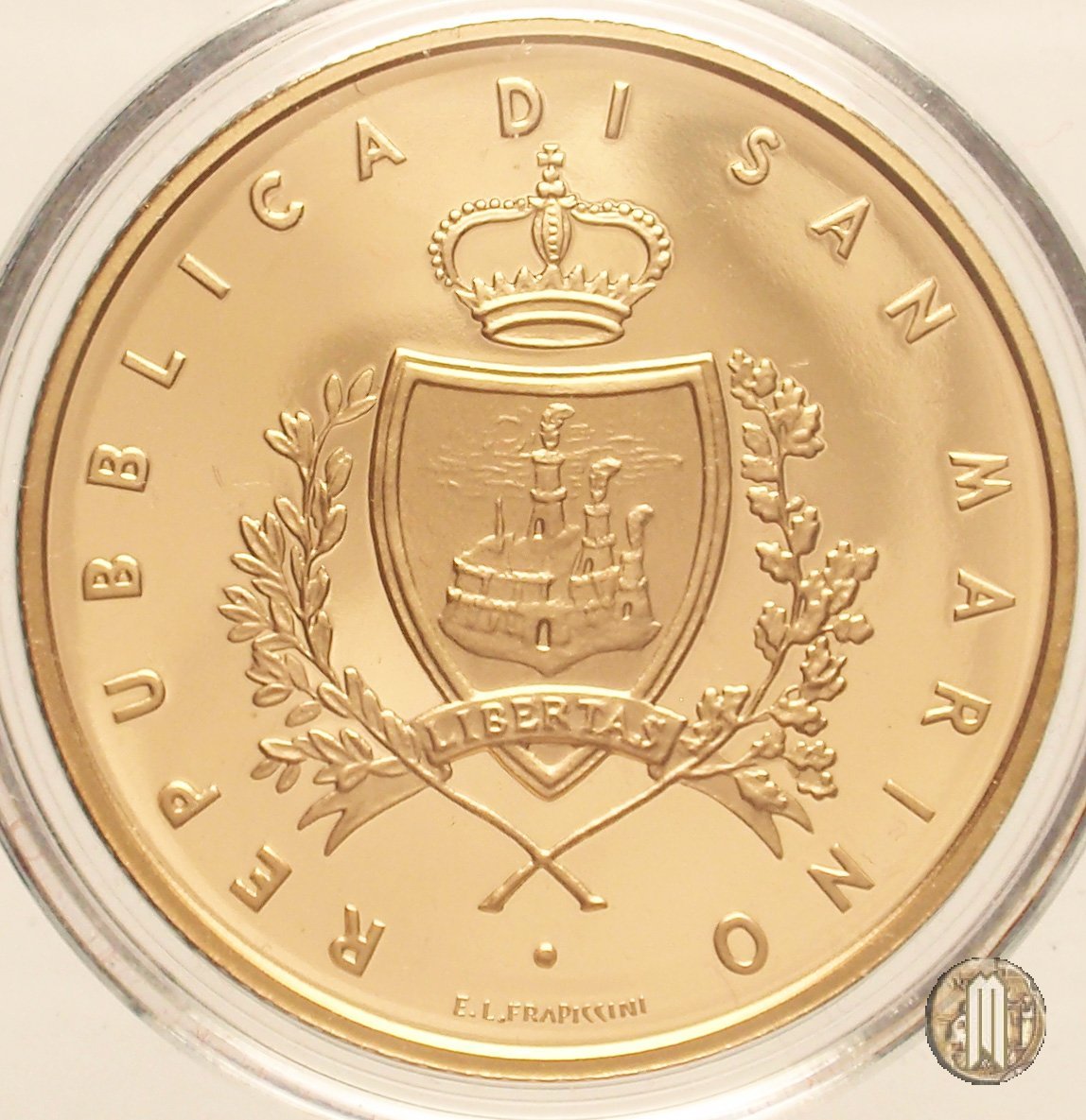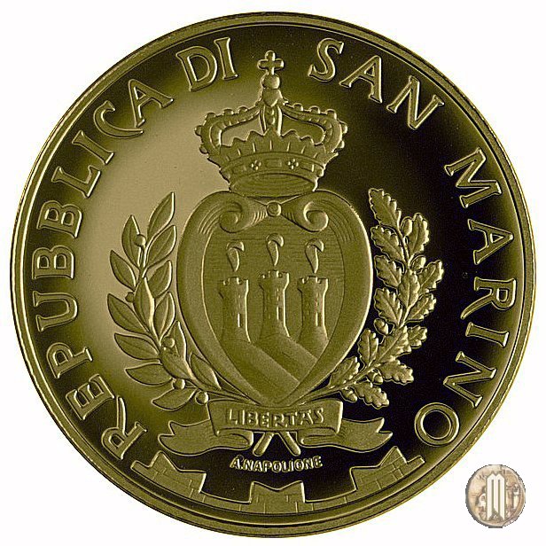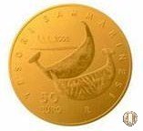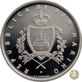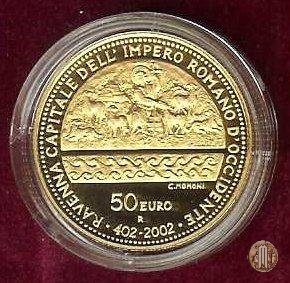 50 Euro 2002 1600° ann. Ravenna cap. Imp. Rom. Dritto: Elementi ispirati a decorazioni dell'arte bizantina, al centro delle quali sono rappresentati lo stemma con la corona, il ramo di alloro, il ramo della quercia e sotto la scritta "LIBERTAS". In tondo la scritta "REPUBBLICA DI SAN MARINO". Verso: Decorazione musiva che raffigura il Buon Pastore. In tondo la scritta "RAVENNA CAPITALE DELL'IMPERO ROMANO D'OCCIDENTE "402 - 2002", in basso il nome dell'autore del bozzetto "C.MOMONI", il valore "50 EURO". In basso il simbolo della Zecca Italiana che ne ha curato la coniazione "R". A cornice della composizione il "pallinato" | |