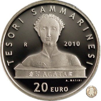 20 Euro 2010 Tesori Sammarinesi Dritto: Stemma stilizzato della Repubblica raffigurante al centro uno scudo che racchiude le Tre Torri sormontate da tre penne. In alto la corona chiusa, in basso il cartiglio con la legenda "LIBERTAS" tra il ramo di ulivo e di quercia. Completano la moneta la scritta "REPUBBLICA DI SAN MARINO" e il nome dell'autore del bozzetto "E.L. FRAPICCINI". Verso: Rappresentazione del busto ligneo policromo di "S. Agata", autore ignoto del XVI secolo, custodito al Museo di Stato della Repubblica di San Marino. Alla base dell'opera la legenda "S. AGATA", il nome dell'autore del bozzetto "A. MASINI" e il valore "20 EURO"; a destra l'anno di emissione "2010", a giro la legenda "TESORI SAMMARINESI". La moneta è completata dal simbolo "R" della Zecca Italiana che ha curato la coniazione. | |