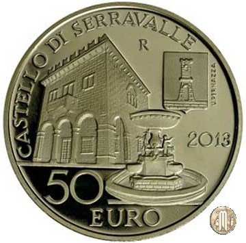 50 Euro 2013 Elementi Architettonici Sammarinesi CASTELLO DI SERRAVALLE Dritto: Lo stemma della Repubblica di San Marino, alla base dell'emblema il nome dell'autore del bozzetto "A. NAPOLIONE", in giro la scritta "REPUBBLICA DI SAN MARINO". Verso: Composizione di principali elementi architettonici del Castello di Serravalle: la Casa del Castello, la fontana della piazza e lo stemma del Castello di Serravalle; in posizione verticale il nome dell'autore del bozzetto "U. PERNAZZA"; a completare l'anno di emissione "2013"; il valore "50 EURO", il simbolo "R" identificativo della Zecca di Roma, in giro la legenda "CASTELLO DI SERRAVALLE". | |