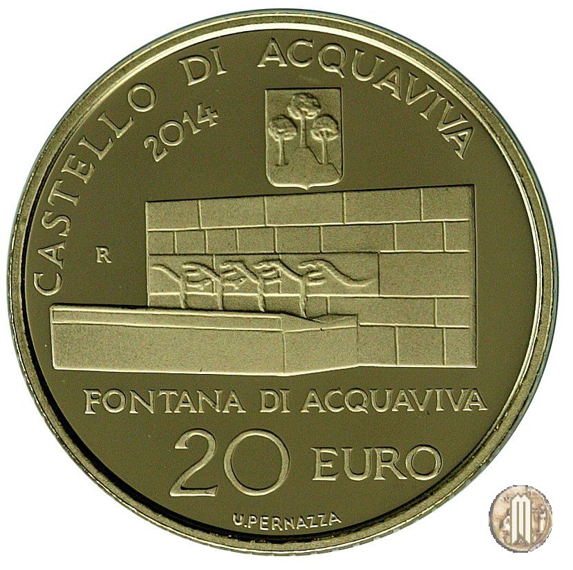 20 Euro 2014 Elementi Architettonici Sammarinesi CASTELLO DI ACQUAVIVA Dritto: stemma di Stato della Repubblica di San Marino; in giro, la scritta "REPUBBLICA DI SAN MARINO"; alla base, il nome dell'autore "A. NAPOLIONE". Verso: Rappresentazione della nuova fontana di Acquaviva, il cui nome deriva da una vena d'acqua zampillante alle falde di Monte Cerreto. In alto, lo stemma araldico del Castello di Acquaviva; in esergo, la legenda "FONTANA DI ACQUAVIVA", il valore "20 EURO" e il nome dell'autore "U. PERNAZZA"; nella parte superiore, ad arco, la scritta "CASTELLO DI ACQUAVIVA" e l'anno di emissione "2014"; a sinistra, "R", acronimo di Roma identificativo della Zecca. | |
