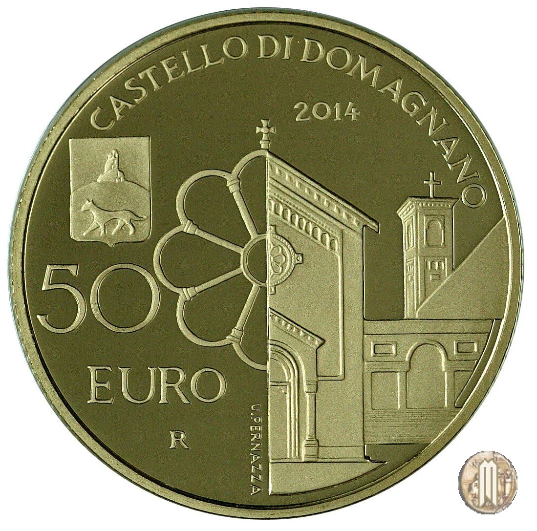 50 Euro 2014 Elementi Architettonici Sammarinesi CASTELLO DI DOMAGNANO Dritto: Stemma di Stato della Repubblica di San Marino; in giro, la scritta "REPUBBLICA DI SAN MARINO"; alla base, il nome dell'autore "A. NAPOLIONE". Verso: Un particolare della Chiesa di San Michele Arcangelo di Domagnano affiancato dal caratteristico rosone. In alto a sinistra, lo stemma araldico del Castello di Domagnano seguito dal valore "50 EURO" ed "R", acronimo di Roma identificativo della Zecca; al centro, in verticale, il nome dell'autore "U. PERNAZZA"; in alto, ad arco, la scritta "CASTELLO DI DOMAGNANO" e l'anno di emissione "2014". |