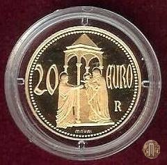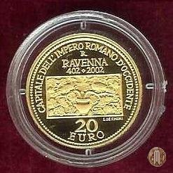 20 Euro 2002 1600° ann. Ravenna cap. Imp. Rom. Dritto: Elementi ispirati a decorazioni dell'arte bizantina, al centro delle quali sono rappresentati lo stemma con la corona, il ramo di alloro, il ramo della quercia e sotto la scritta "LIBERTAS". In tondo la scritta "REPUBBLICA DI SAN MARINO". Verso: Vaso ansato da cui si originano due tralci di vite sui quali posano due pavoni affrontati alla croce monogrammatica. In tondo la scritta "CAPITALE DELL'IMPERO ROMANO D'OCCIDENTE", al centro in alto il simbolo della Zecca Italiana che ne ha curato la coniazione "R", "RAVENNA 402 + 2002", in basso il nome dell'autore del bozzetto "L. DE SIMONI" e il valore "20 EURO". A cornice della composizione il "pallinato" | |