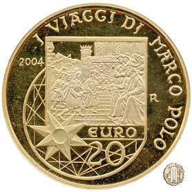 20 Euro 2004 750° ann. nasc. Marco Polo Dritto: Le tre penne di San Marino stilizzate, sullo sfondo i continenti toccati dai viaggi di Marco Polo, la scritta "REPUBBLICA DI SAN MARINO"; il nome dell'autore del bozzetto "COLANERI". Verso: Miniatura rappresentante l'arrivo in Cina e l'introduzione del giovane Marco alla corte di Kublai, il Gran Khan. In basso la rosa dei venti che simbolicamente rappresenta il viaggio. In alto attorno alla moneta la scritta "I VIAGGI DI MARCO POLO", sotto il valore la scritta "EURO 20", sul lato sinistro l'anno di emissione "2004", sul lato destro il simbolo della Zecca Italiana che ne ha curato la coniazione "R". | |