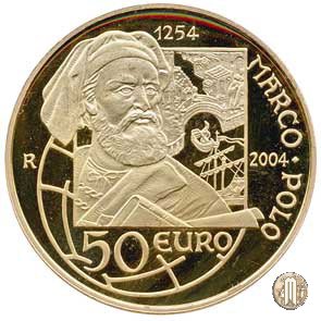50 Euro 2004 750° ann. nasc. Marco Polo Dritto: Le tre penne di San Marino stilizzate, sullo sfondo i continenti toccati dai viaggi di Marco Polo, la scritta "REPUBBLICA DI SAN MARINO"; il nome dell'autore del bozzetto "COLANERI". Verso: Al centro il ritratto di Marco Polo, alle sue spalle la miniatura rappresentante la partenza da Venezia. In alto la scritta "1254", a destra attorno alla moneta la scritta "MARCO • POLO", sotto il valore "50 EURO", sul lato destro l'anno di emissione "2004", sul lato sinistro il simbolo della Zecca Italiana che ne ha curato la coniazione "R". | |