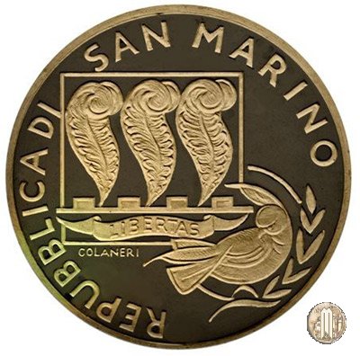 50 Euro 2006 500° ann. nasc. G. B. Belluzzi Dritto: Al centro lo scudo sannitico nel quale compaiono tre roccioni circondati da una cinta muraria, sopra i quali le Tre Torri sormontate da tre penne. In alto la corona chiusa, in basso il cartiglio con la legenda "LIBERTAS"; nel lato sinistro un ramo di ulivo, nel lato destro un ramo di quercia. Completano la moneta la scritta "REPUBBLICA DI SAN MARINO". Verso: Il ritratto di Giovan Battista Belluzzi. A sinistra il valore "50 EURO", in alto la legenda "GIOVAN BATTISTA BELLUZZI 1506 2006". Completano la moneta il simbolo della Zecca Italiana che ne ha curato la coniazione "R", l'anno di emissione, il nome dell'incisore "MOMONI INC." e il nome dell'autore del bozzetto "VEROI". | |