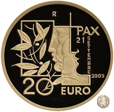 20 Euro 2005 Giornata Internazionale della Pace Dritto: Le tre penne di San Marino racchiuse in rettangolo, sotto un nastrino con la scritta "LIBERTAS" e una colomba appoggiata ad un ramo d'ulivo. Completano la moneta la scritta "REPUBBLICA DI SAN MARINO" ed il nome dell'autore del bozzetto "COLANERI". Verso: Un gioco di linee all'interno delle quali un ramo d'ulivo, i profili di un uomo ed un bambino e il profilo stilizzato di un volto alla destra del quale la scritta "PAX 21" in orizzontale, e la scritta "SETTEMBRE" in verticale. Completano la moneta in basso il valore "20 EURO", a destra l'anno di emissione "2005" e in alto il simbolo della Zecca Italiana che ne ha curato la coniazione "R". | |