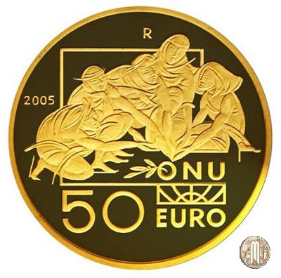 50 Euro 2005 Giornata Internazionale della Pace Dritto: Le tre penne di San Marino racchiuse in rettangolo, sotto un nastrino con la scritta "LIBERTAS" e una colomba appoggiata ad un ramo d'ulivo. Completano la moneta la scritta "REPUBBLICA DI SAN MARINO" ed il nome dell'autore del bozzetto "COLANERI". Verso: Quattro linee al centro racchiudono l'immagine di cinque persone, sedute o inginocchiate, che si tendono la mano in segno di unione per la pace. Un ramo d'ulivo interseca la lettera O della scritta "ONU", sotto il valore "50 EURO". In alto, a sinistra, l'anno di emissione "2005", al centro il simbolo della Zecca Italiana che ne ha curato la coniazione "R". | |