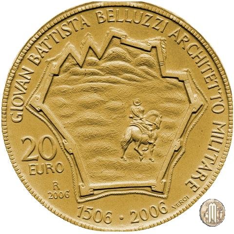 20 Euro 2006 500° ann. nasc. G. B. Belluzzi Dritto: Al centro lo scudo sannitico nel quale compaiono tre roccioni circondati da una cinta muraria, sopra i quali le Tre Torri sormontate da tre penne. In alto la corona chiusa, in basso il cartiglio con la legenda "LIBERTAS"; nel lato sinistro un ramo di ulivo, nel lato destro un ramo di quercia. Completano la moneta la scritta "REPUBBLICA DI SAN MARINO". Verso: La planimetria di una fortificazione tratta da un disegno del Belluzzi che mostra gli speroni della fortificazione con le piazzole per i cannoni; al centro della fortificazione un cavaliere con il bastone di comando. A sinistra il valore "20 EURO", in alto la legenda "GIOVAN BATTISTA BELLUZZI ARCHITETTO MILITARE", in basso "1506 • 2006". Completano la moneta il simbolo della Zecca Italiana che ne ha curato la coniazione "R", l'anno di emissione, il nome dell'incisore "MOMONI INC." e il nome dell'autore del bozzetto "VEROI". | |