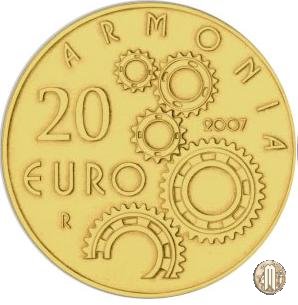 20 Euro 2007 Convivenza Sociale Dritto: Inserita in un esagono, una composizione delle tre caratteristiche torri dello Stato con ingranaggi che si fondono raffigurando la merlatura degli edifici; all'interno di una merlatura la legenda "LIBERTAS". In alto la legenda "REPUBBLICA DI", sulla sinistra, alla base, composta su due righe, "SAN MARINO"; a destra il nome dell'autore del bozzetto "A. MASINI". Verso: Composizione di un sistema di ingranaggi dove tutti i suoi componenti cooperano con la stessa valenza per generare il movimento voluto. In alto ad arco la scritta "ARMONIA"; al centro, a sinistra la legenda "20 EURO", a destra l'anno di emissione "2007". Completano la moneta il simbolo della Zecca Italiana che ne ha curato la coniazione "R". | |