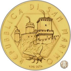 50 Euro 2011 Elementi Architettonici Sammarinesi CASTELLO DELLA CITTA' DI SAN MARINO Dritto: Lo stemma della Repubblica di San Marino contornato dalla legenda "REPUBBLICA DI SAN MARINO". In basso il nome dell'autore del bozzetto "BINO BINI" e l'anno "2011". Verso: Al centro la Statua della Libertà, a destra la porta di San Francesco, a sinistra lo stemma del Castello della Città di San Marino. A completare, a giro la legenda "CASTELLO DELLA CITTA' DI SAN MARINO", in basso "EU 50 RO". La moneta è completata dal simbolo "R" della Zecca Italiana che ha curato la coniazione ed il nome dell'autore del bozzetto "U. PERNAZZA", Uliana Pernazza. | |