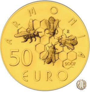 50 Euro 2007 Convivenza Sociale Dritto: Al centro, inquadrate attraverso un diaframma esagonale che richiama la cella dellâarnia, le tre torri della Repubblica viste dal lato costone. In basso raffigurazione di un'ape mellifica, intorno la scritta "REPUBBLICA DI SAN MARINO", alla base il nome dell'autore del bozzetto "V. DE SETA". Verso: In primo piano rappresentazione di api mellifiche nella produzione del miele, frutto di cooperazione. In tondo nella parte superiore la scritta "ARMONIA"; in basso a sinistra la legenda "50 EURO", a destra l'anno di emissione "2007". Completano la moneta il simbolo della Zecca Italiana che ne ha curato la coniazione "R". | |