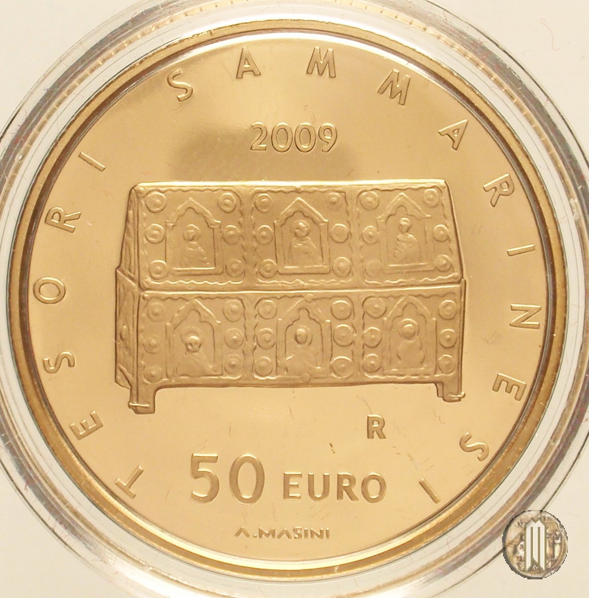 50 Euro 2009 Tesori Sammarinesi Dritto: Stemma stilizzato della Repubblica raffigurante al centro uno scudo che racchiude le Tre Torri sormontate da tre penne. In alto la corona chiusa, in basso il cartiglio con la legenda "LIBERTAS" tra il ramo di ulivo e di quercia. Completano la moneta la scritta "REPUBBLICA DI SAN MARINO" e il nome dell'autore del bozzetto "E.L. FRAPICCINI". Verso: In primo piano cofano reliquiario del XIII secolo, dono di Carlo De Bruch. Contorna la moneta la legenda "TESORI SAMMARINESI". Completano la moneta il valore "50 EURO", il simbolo "R" della Zecca Italiana che ne ha curato la coniazione, l'anno di emissione "2009" e il nome dell'autore del bozzetto "A. MASINI". | |