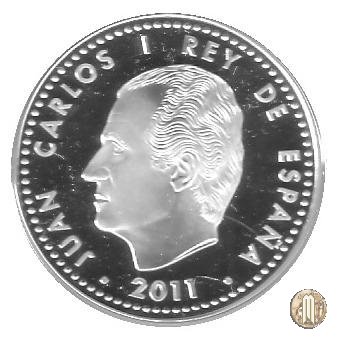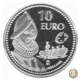 10 Euro 2011 Programa Europa - Orellana Dritto: Effigie del Re di Spagna Carlo I, sotto l'anno d'emissione, sul giro la legenda JUAN CARLOS I REY DE ESPAGÑA, contorna il tutto una serie di perle. Verso: Riproduzione di Francisco de Orellana, sulla destra l'immagine di una barca capitanata dall'esploratore, sotto la barca il marchio di zecca, sopra il logo ![]() adottato dai paesi per l'emissione delle monete dedicato al Programma Europa; in alto il valore facciale su due righe, lungo il bordo una serie di perle. | |