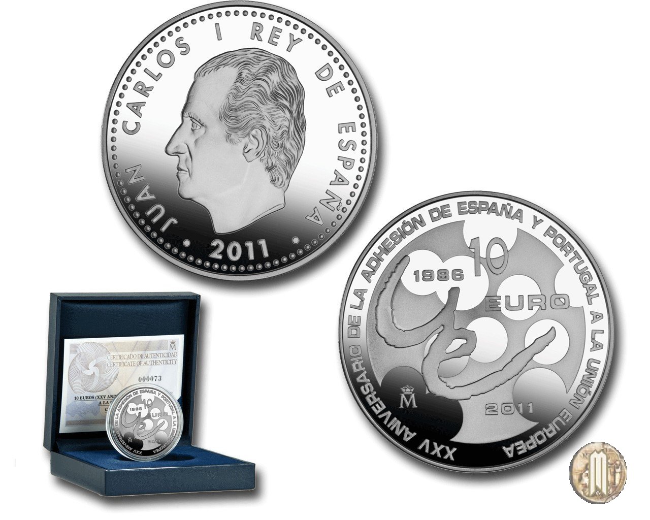 10 Euro 2011 XXV Aniversario Adhesión de España y Portugal a la Union Europea Dritto: Effigie del Re di Spagna Carlo I, sotto l'anno d'emissione, sul giro la leggenda JUAN CARLOS I REY DE ESPAGÑA, contorna il tutto una serie di perle. Verso: In background dei cerchi sparsi sul campo, in primo piano ue in corsivo, in alto il valore nominale e sulla sinistra la data 1986, e in basso a destra la data 2006, a sinistra il simbolo di zecca, sul giro la legenda XXV ANIVERSARIO ADHESIÓN DE ESPAGÑA Y PORTOGAL A LA UNION EUROPEA. | |