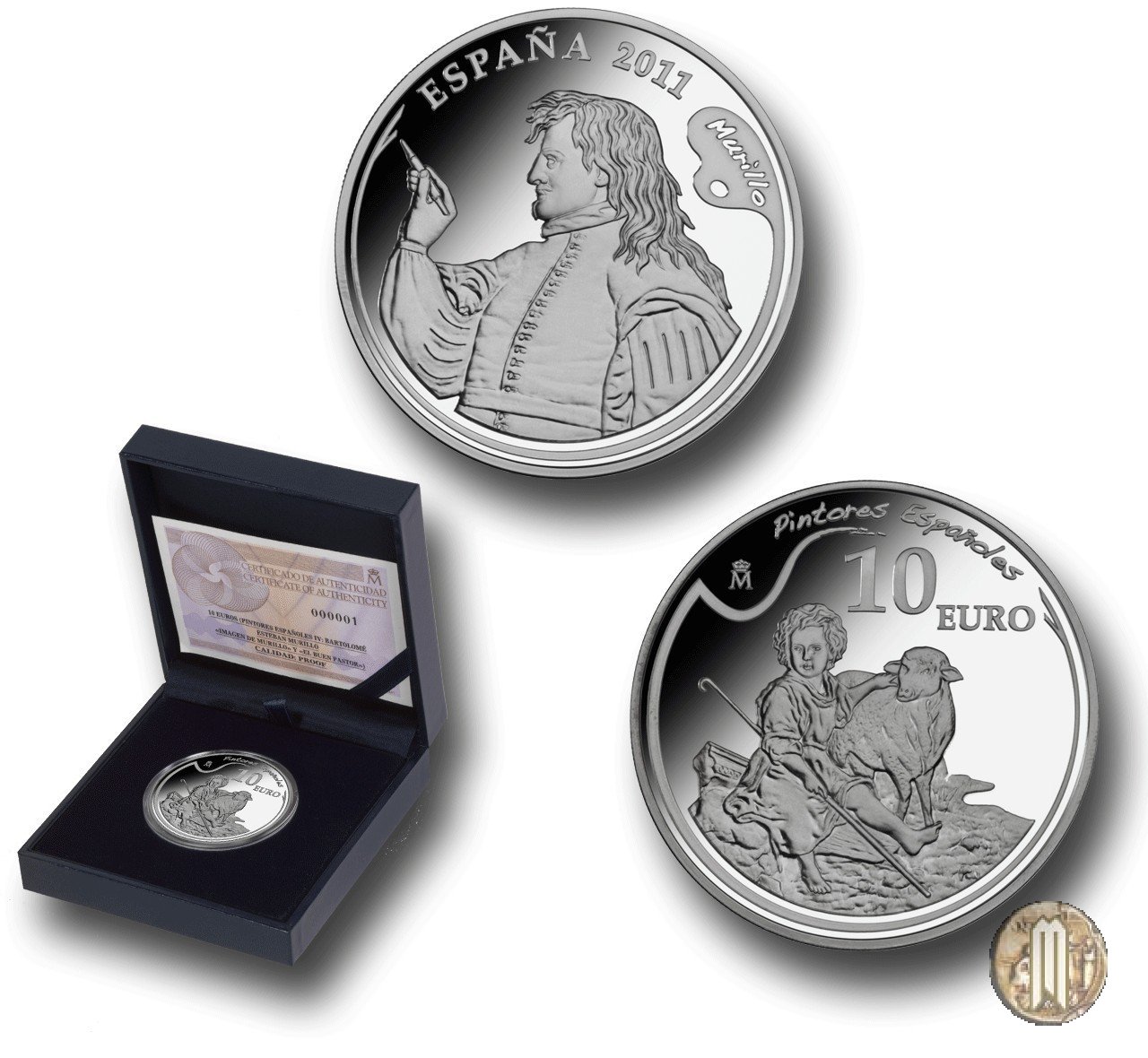 10 Euro 2011 Pintores Españoles - Murillo Dritto: Riproduzione di Bartolomé Esteban Murillo, come scolpito sul medaglione dallo scultore Barba Ramon (1767-1831), che si trova sulla facciata del Museo del Prado a Madrid, in alto la legenda ESPAGÑA e l'anno di emissione, sul bordo a destra su una tavolozza stilizzata la firma del pittore. Verso: Riproduzione del dipinto "El Buen Pastor" di Bartolomé Esteban Murillo conservato nel Museo Nacional del Prado a Madrid, in alto il valore nominale, in alto a sinistra il simbolo di zecca, in circolo in alto la legenda PINTORES ESPAÑOLES. | |