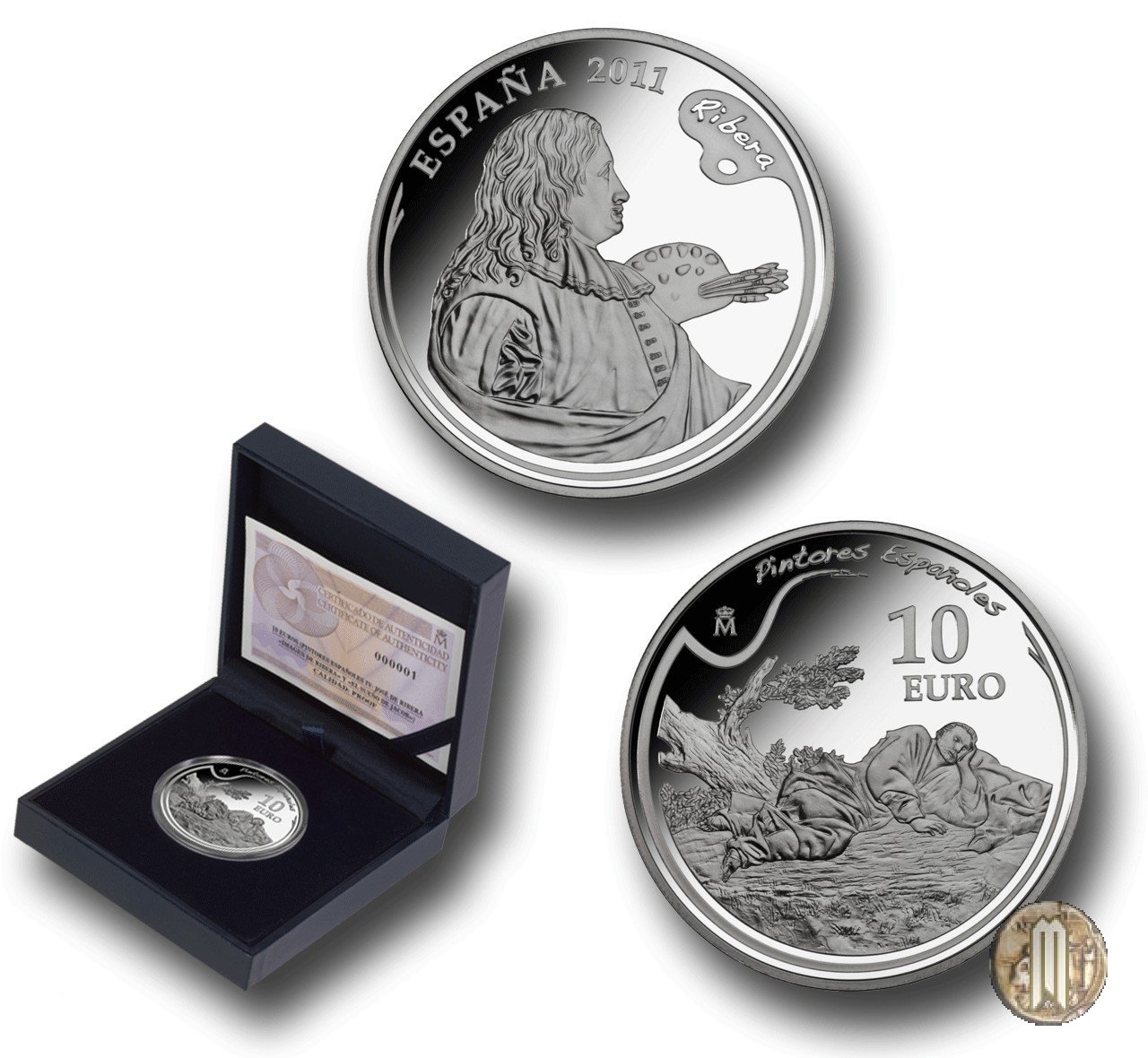 10 Euro 2011 Pintores Españoles - Ribera Dritto: Riproduzione di José de Ribera, come scolpito sul medaglione dallo scultore Barba Ramon (1767-1831), che si trova sulla facciata del Museo del Prado a Madrid, in alto la legenda ESPAGÑA e l'anno di emissione, sul bordo a destra su una tavolozza stilizzata la firma del pittore. Verso: Riproduzione del dipinto "Il sogno di Giacobbe" di José de Ribera conservato nel Museo Nacional del Prado a Madrid, in alto il valore nominale, in alto a sinistra il simbolo di zecca, in circolo in alto la legenda PINTORES ESPAÑOLES. | |