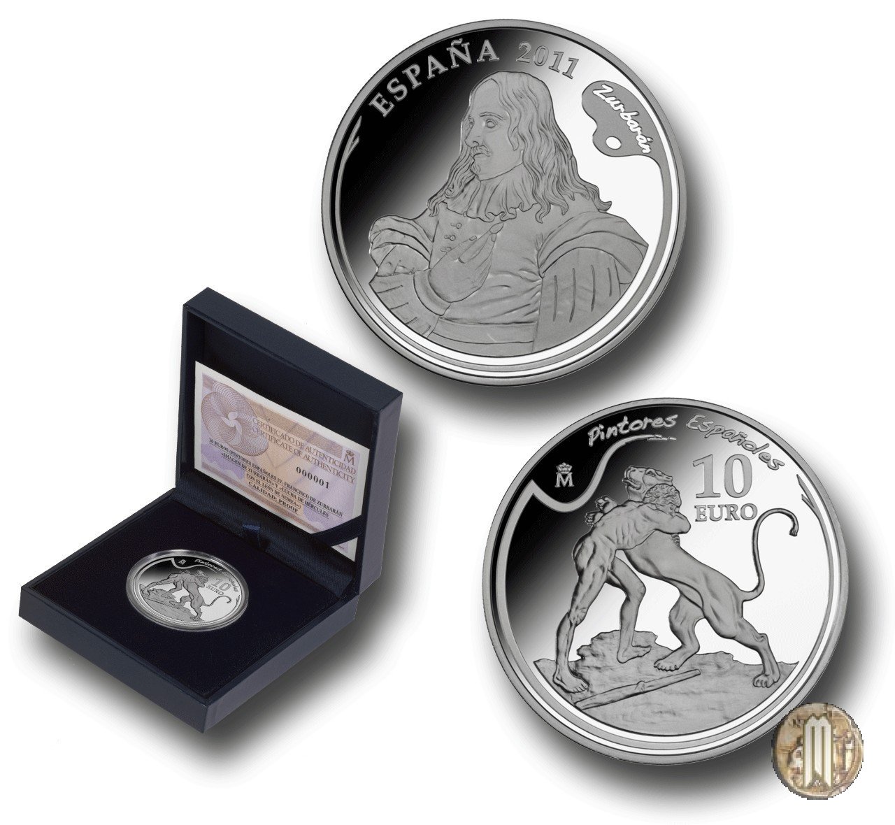10 Euro 2011 Pintores Españoles - Zurbarán Dritto: Riproduzione di Francisco de Zurbarán, come scolpito sul medaglione dallo scultore Barba Ramon (1767-1831), che si trova sulla facciata del Museo del Prado a Madrid, in alto la legenda ESPAGÑA e l'anno di emissione, sul bordo a destra su una tavolozza stilizzata la firma del pittore. Verso: Riproduzione del dipinto 'Lucha de Hércules con el león de Nemea' conservato nel Museo Nacional del Prado a Madrid, in alto il valore nominale, in alto a sinistra il simbolo di zecca, in circolo in alto la legenda PINTORES ESPAÑOLES. | |