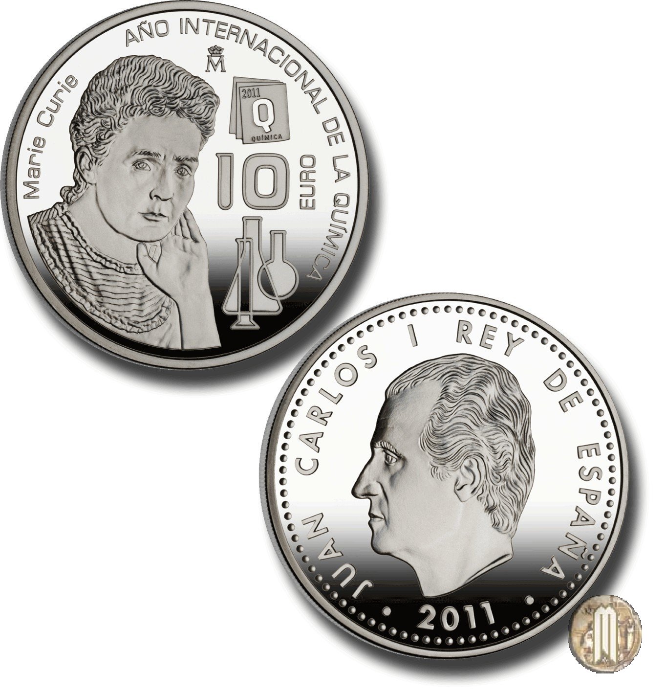 10 Euro 2011 Año Internacional de la Química Dritto: Effigie del Re di Spagna Carlo I, sotto l'anno d'emissione, sul giro la legenda JUAN CARLOS I REY DE ESPAGÑA, sull'orlo una serie di perle. Verso: A sinistra in primo piano l'immagine di Marie Curie, dal Musée Curie (Coll. ACJC) a Parigi, e a sinistra, in circolo, la legenda Marie Curie segue sul giro la legenda AÑO INTERNACIONAL DE LA QUÍMICA, in alto il marchio di zecca; a destra: in alto il logo dell'Anno Internazionale della Chimica, al centro il valore nominale della moneta, e in basso alcuni oggetti da laboratorio. | |