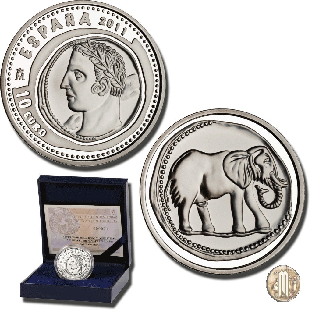 10 Euro 2011 Joyas Numismáticas - 1,5 Shekel Dritto: In posizione eccentrica una riproduzione del dritto della moneta da 1,5 siclo ispano-cartaginese; sul giro, a sinistra il segno di zecca, segue verso l'alto la legenda ESPAGÑA e l'anno di emissione, mentre da sinistra verso il basso il valore nominale, bordo perlato. Verso: Riproduzione del retro della stessa moneta che raffigura un elefante. | |