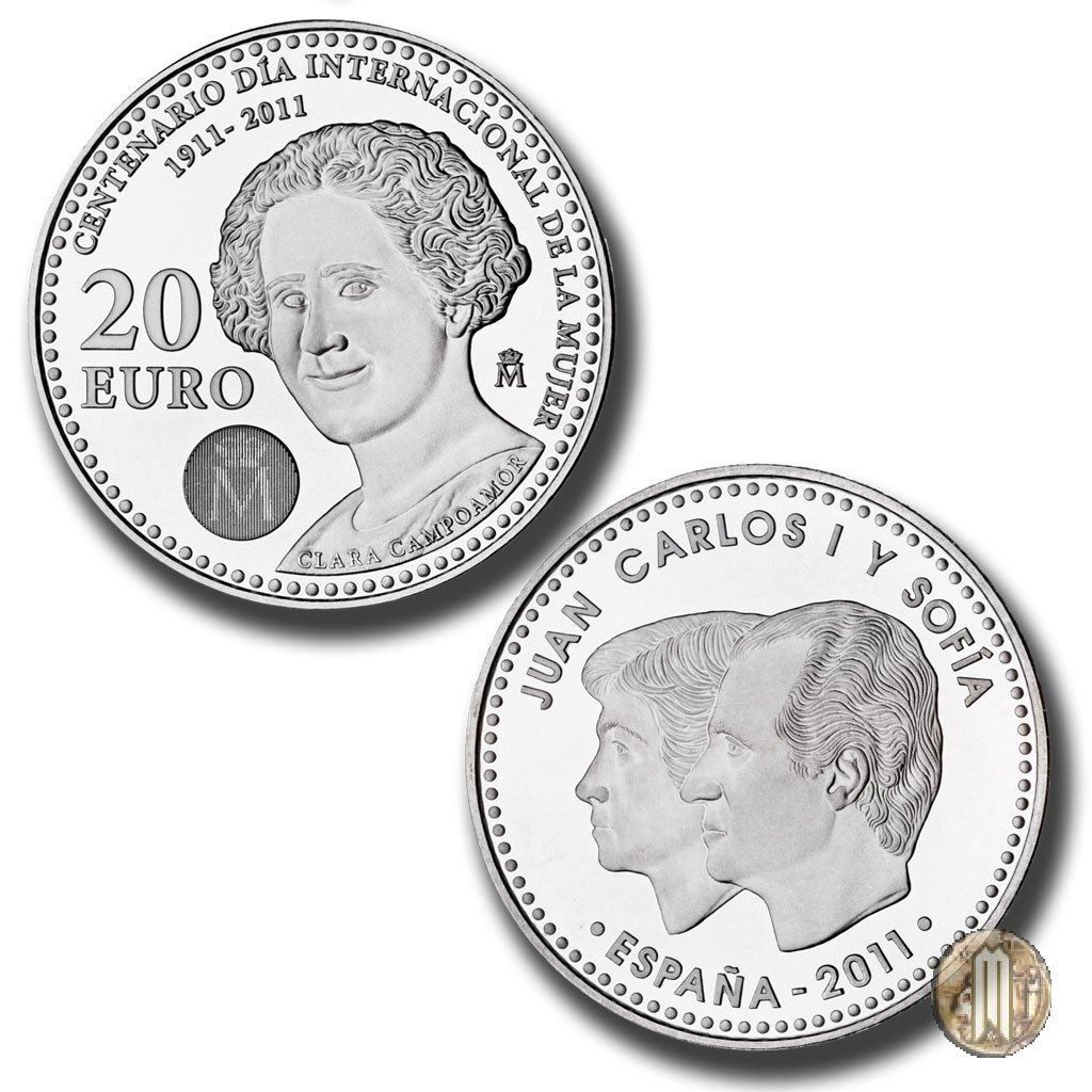 20 Euro 2011 Centenario Día de la Mujer Dritto: L'effigi dei SS. MM. Re Juan Carlos e la regina Sofia in sovrapposizione, in circolo in alto la legenda JUAN CARLOS I Y SOFIA, in basso l'anno di emissione e la scritta ESPAGÑA, contorna il tutto una serie di perle. Verso: L'immagine di Clara Campoamor, a destra il simbolo di zecca, a sinistra sotto la lettera M coronata, al centro il valore nominale su due righe, in alto in circolo la legenda 1911-2011, sul giro la legenda CENTENARIO DÍA INTERNACIONAL DE LA MUJER, un giro di perle sul bordo. | |
