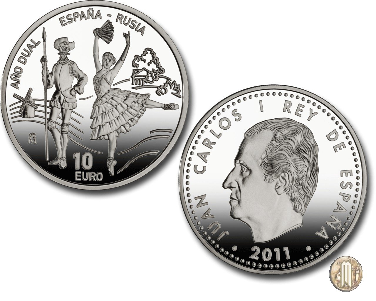 10 Euro 2011 Año dual España-Rusia Dritto: Effigie del Re di Spagna Carlo I, sotto l'anno d'emissione, sul giro la legenda JUAN CARLOS I REY DE ESPAÑA, sull'orlo una serie di perle. Verso: In primo piano a sinistra raffigurazione di Don Chisciotte e a destra una ballerina russa, sullo sfondo a sinistra tipico paesaggio della Mancia a destra paesaggio russo. A sinistra in basso il segno di zecca. In basso il valore nominale. Sul giro da sinistra verso l'alto la legenda AÑO DUAL ESPAÑA-RUSIA. | |