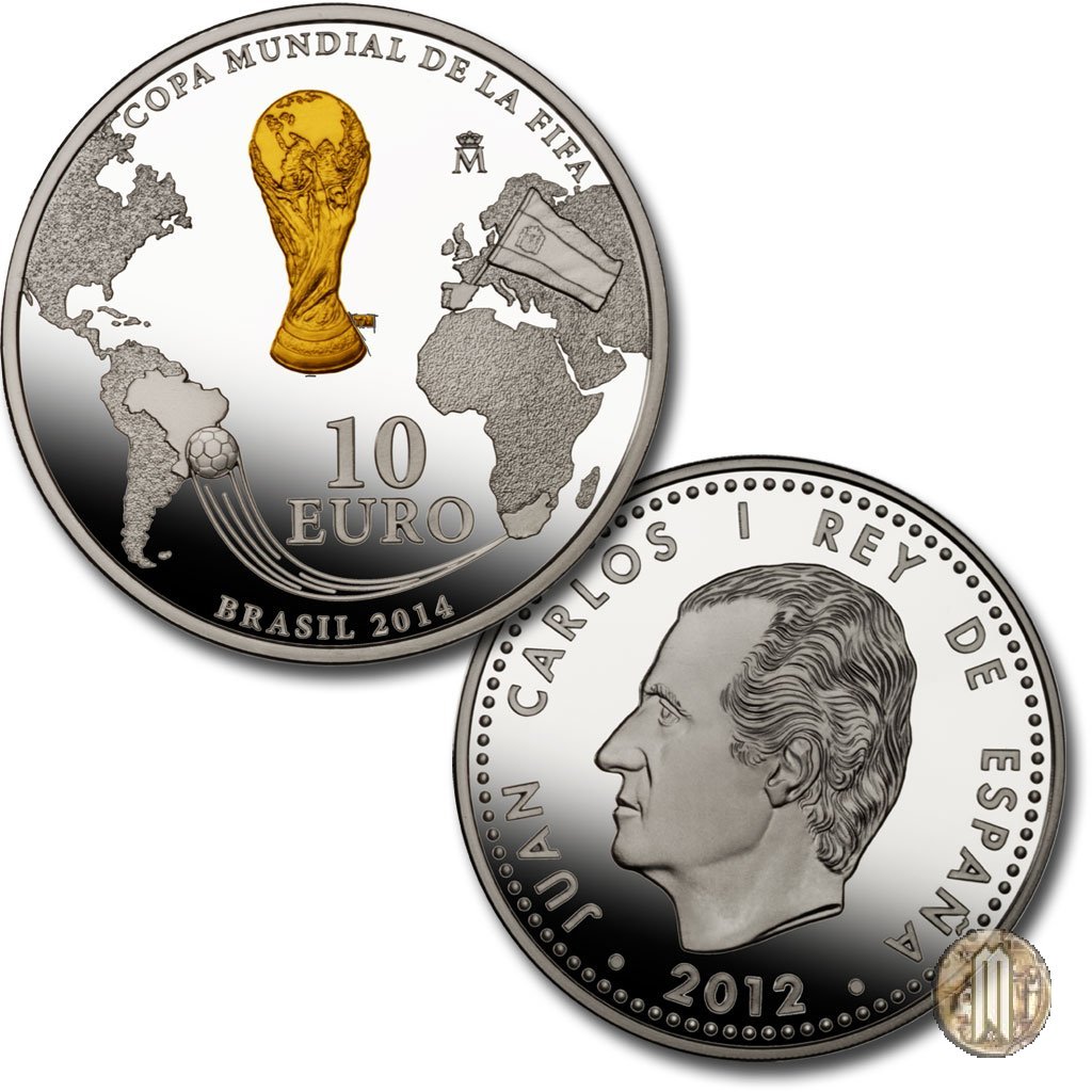 10 Euro 2012 Copa Mundial FIFA - Brasil 2014 Dritto: Effigie del Re di Spagna Carlo I, sotto l'anno d'emissione, sul giro la leggenda JUAN CARLOS I REY DE ESPAÑA, contorna il tutto una serie di perle. Verso: In primo piano un'immagine della mappa del mondo, tre i paesi evidenziati: Spagna (attuale campione del mondo, rappresentata dalla bandiera spagnola), Sud Africa e Brasile (uniti da righe e da una palla, ricordando l'ultimo e il prossimo ospite della Coppa del Mondo FIFA ), al centro, placcata in oro, la World Cup Trophy Cup. In basso il valore nominale, in alto a destra il segno di zecca, sul giro alto la legenda COPA MUNDIAL DE LA FIFA nel giro basso BRASIL 2014. | |