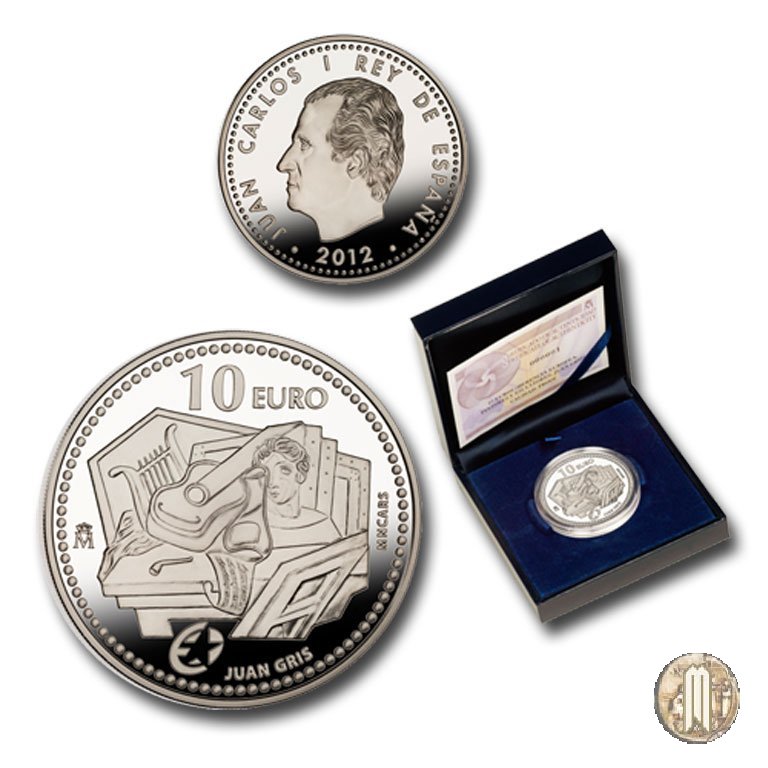 10 Euro 2012 Programa Europa - Juan Gris Dritto: Effigie del Re di Spagna Carlo I, sotto l'anno d'emissione, sul giro la leggenda JUAN CARLOS I REY DE ESPAÑA, contorna il tutto una serie di perle. Verso: In primo piano il dipinto La Table du musicien (La tabella del musicista), in alto il valore nominale, a destra la firma dell'incisore, in basso a sinistra l'Eurostar logo ![]() del Programma Europa a destra il titolo della moneta, a sinistra la 'M' coronata simbolo di zecca. Completa la moneta un fine giro di perle. | |