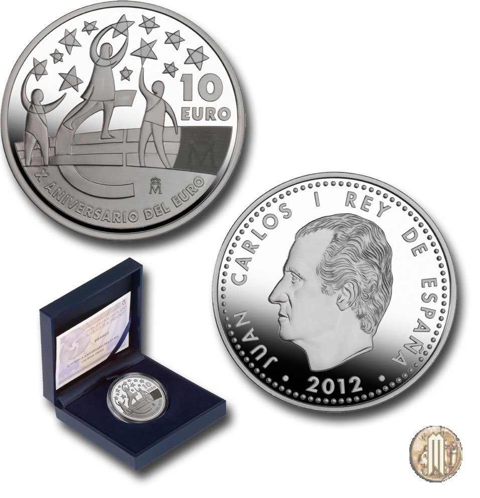 10 Euro 2012 X Aniversario del Euro Dritto: Effigie del Re di Spagna Carlo I, sotto l'anno d'emissione, sul giro la legenda JUAN CARLOS I REY DE ESPAÑA segue in basso l'anno di emissione, sul bordo una serie di perle. Verso: Al centro il simbolo dell'euro, nel campo superiore l'immagine stilizzata di 3 bambini che giocano con le 12 stelle dell'UE, di varie dimensioni, a destra il valore nominale. Nel campo inferiore il simbolo di zecca, a destra una figura latente con impresso la 'M' coronata e un '12', sul suo giro la legenda X ANIVERSARIO DEL EURO. | |