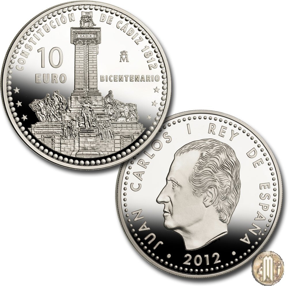 10 Euro 2012 Bicentenario de la Constitución Española Dritto: Effigie del Re di Spagna Carlo I, sotto l'anno d'emissione, sul giro la leggenda JUAN CARLOS I REY DE ESPAÑA, contorna il tutto una serie di perle. Verso: Immagine del Monumento a Las Cortes de Cádiz che si trova in Piazza di Spagna nella città di Cadice, a sinistra il valore nominale, a destra il segno di zecca e sotto la legenda BICENTENARIO, sul giro la legenda COSTITUCIÓN DE CÁDIZ 1812. | |