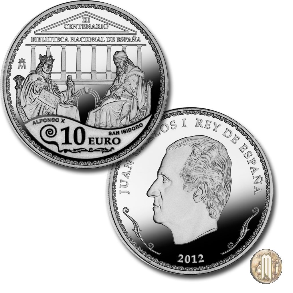 10 Euro 2012 III Centenario de la Biblioteca Nacional Dritto: Effigie del Re di Spagna Carlo I, sotto l'anno d'emissione, sul giro la leggenda JUAN CARLOS I REY DE ESPAÑA, contorna il tutto una serie di mezzeperle. Verso: In primo piano le statue di Alfonso X e di San Isidoro, che si trovano nella scalinata d'ingresso della Biblioteca Nazionale, sullo sfondo è stilizzata la facciata del palazzo, sul frontespizio le legende TERZO CENTENARIO e BIBLIOTECA NACIONAL DE ESPAÑA, a sinistra il segno di zecca, sotto il valore nominale, sul bordo una serie di mezzeperle. | |