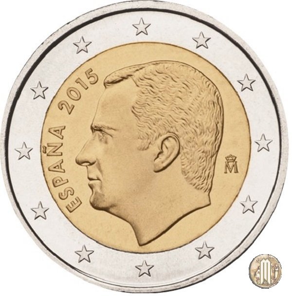 2 Euro Dritto: Al centro della moneta il ritratto di Re Felipe VI di Spagna, re di Spagna dal 19 giugno 2014, rivolto verso sinistra. A sinistra a semicerchio la scritta “ESPAÑA“ e il millesimo di conio; a destra il simbolo della zecca spagnola, la M coronata. Intorno 12 stelle a cinque punte rappresentanti l'Unione Europea. Autore: Luis José Diaz Salas. Verso: Faccia comune. |