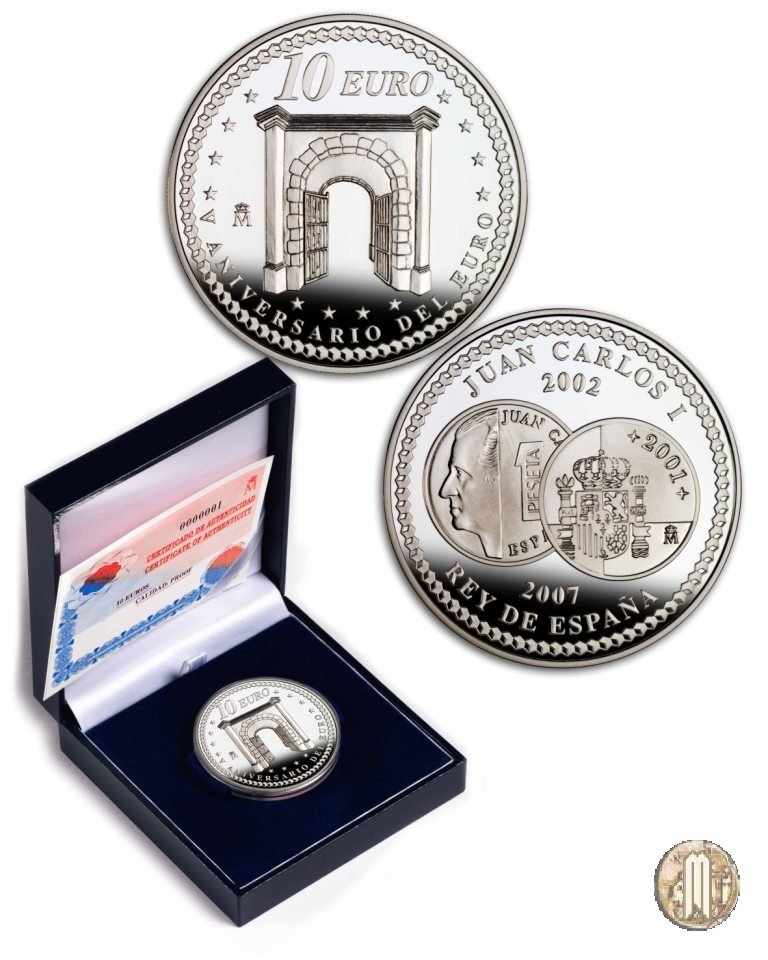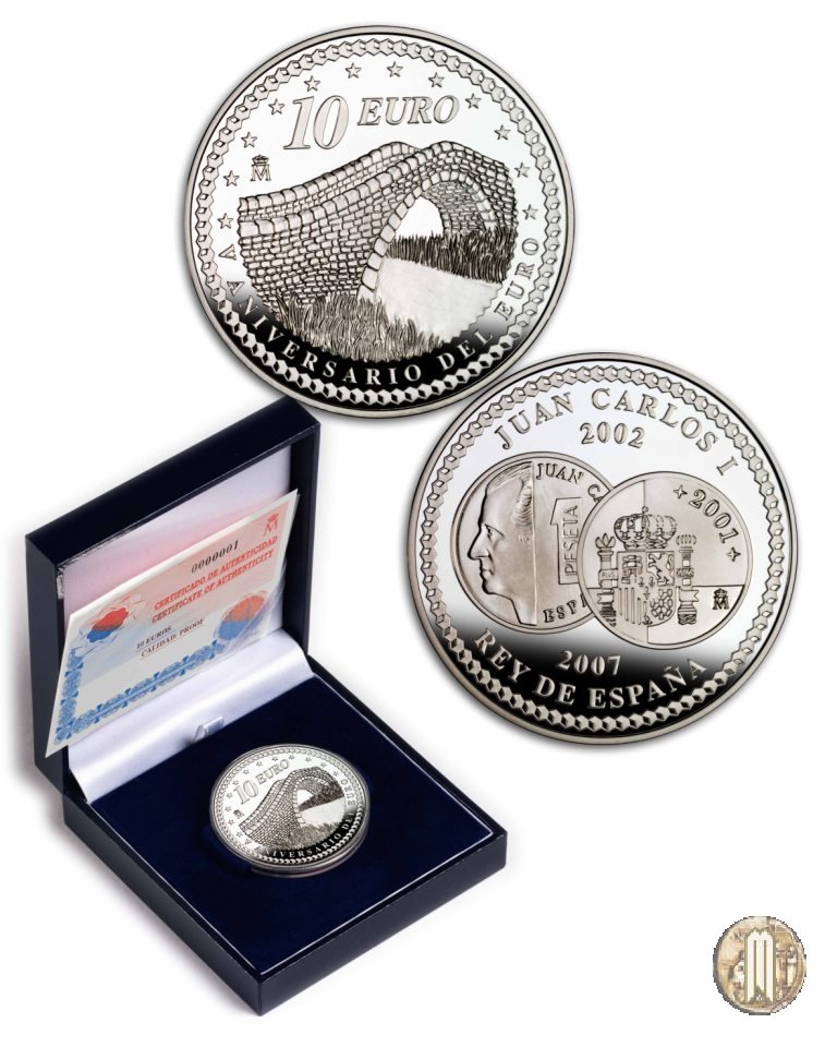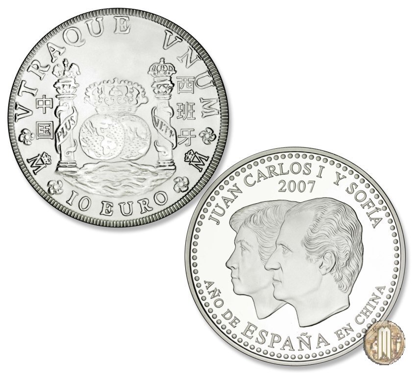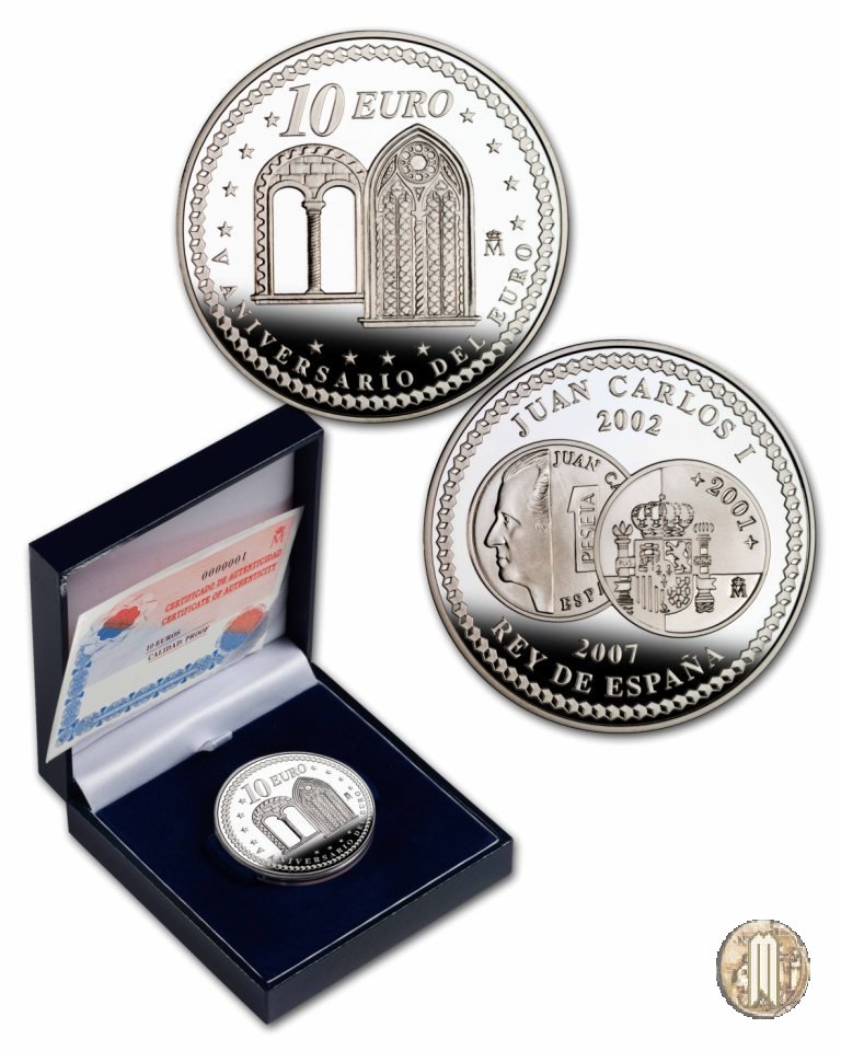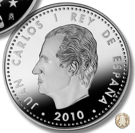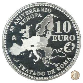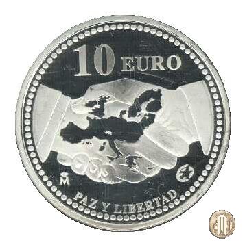 Dritto: Al centro lo scudo costituzionale della Spagna, un interno giro con la legenda JUAN CARLOS I REY DE ESPAGÑA 10 EURO, contorna il giro dieci scudi uno per ogni stato partecipante.