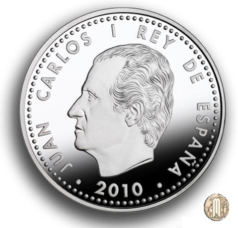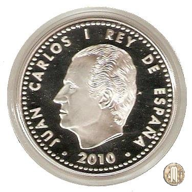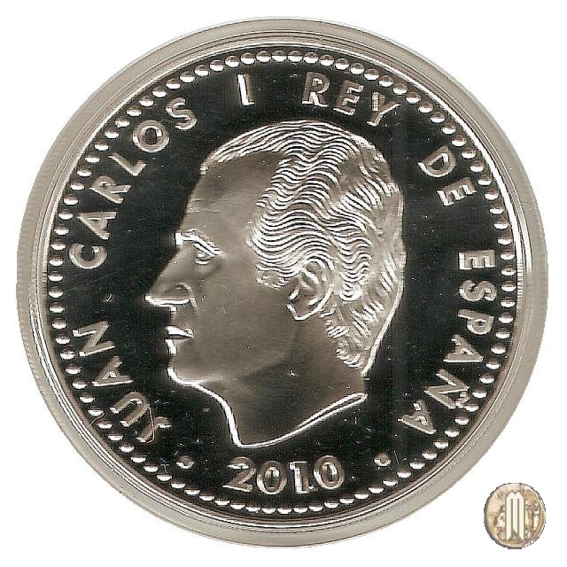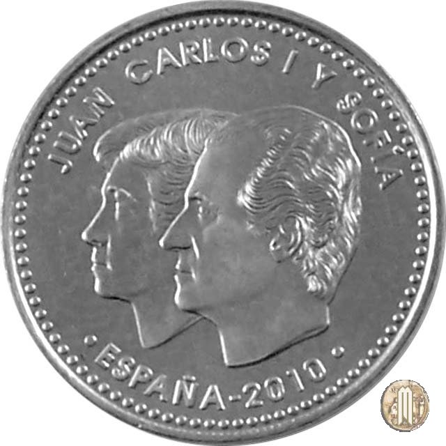 Verso: Al centro: colonna corinzia con tre scie che si incrociano varie volte, a simboleggiare l'incrocio tra le bandiere di Spagna, Belgio e Ungheria, presidenti dell'UE. A destra: valore facciale e 12 stelle di dimensioni crescenti. In alto: logo eu. In basso a destra: simbolo di zecca. In circolo esterno, a sinistra, legenda: PRESIDENCIA ESPAÑOLA DE LA UNIÓN EUROPEA 2010.