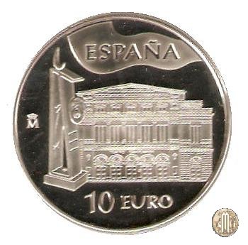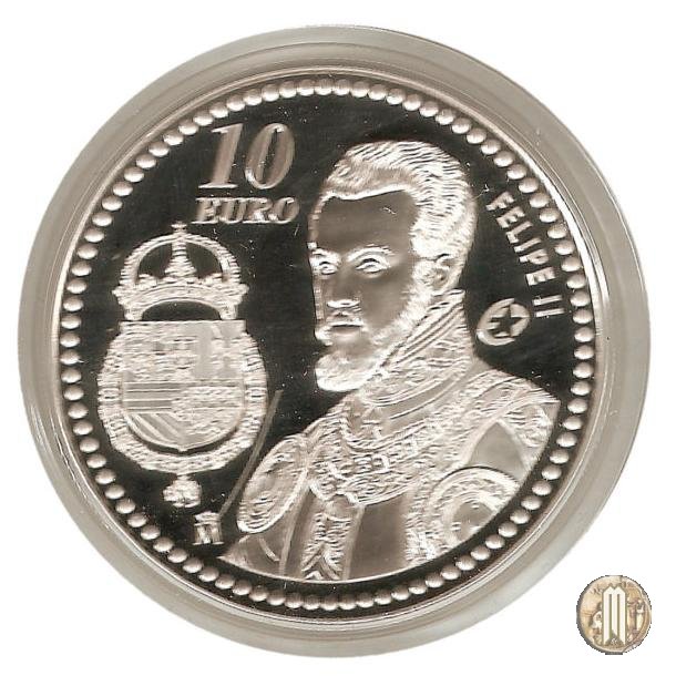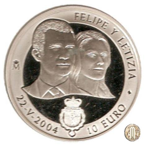 Verso: Sono riprodotti i ritratti di Sua Altezza Reale il Principe delle Asturie Felipe de Borbon y Grecia e Letizia Ortiz Rocasolano, sul giro la legenda FELIPE Y LETIZIA ● 10 EURO ● 22-V-2004 (valore nominale e la data del matrimonio) e a sinistra il segno di zecca, in basso stemma di Felipe di Borbone.