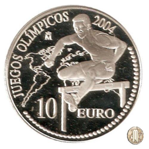 Verso: Immagine di un atleta di corsa a ostacoli e come sfondo una mappa schematizzata del mondo, a sinistra in alto il segno di zecca, la legeda Juegos Olímpicos 2004 seguita da una serie di perle completa il giro, in basso a sinistra il valore nominale della moneta e a destra la legenda EURO.