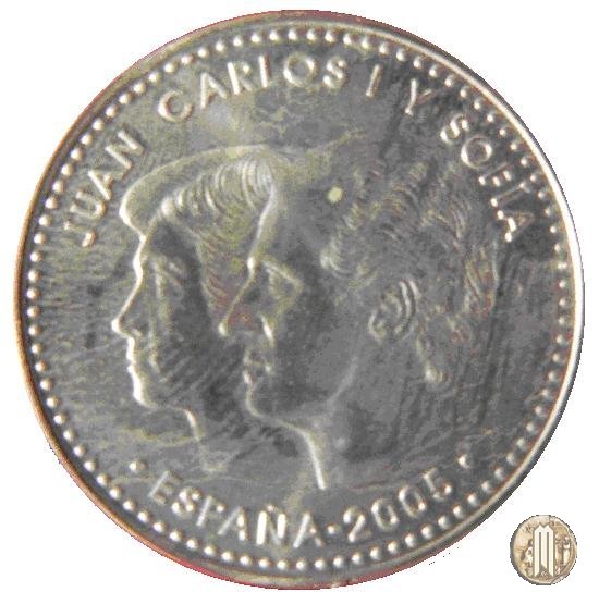 Dritto: L'effigi dei SS. MM. Re Juan Carlos e la regina Sofia in sovrapposizione, in circolo a sinistra la legenda JUAN CARLOS I Y SOFIA, in basso l'anno di emissione e la scritta ESPAGÑA, sull'orlo della moneta una serie di perle.