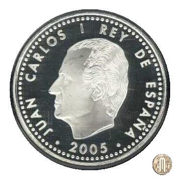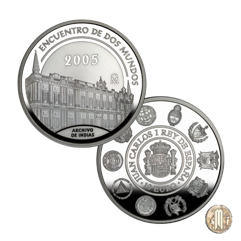Verso: Riproduce una delle facciate del 'Generale Archivo de Indias', in alto a sinistra la scritta 2005 e la legenda INCUENTRO DE DOS MUNDOS, a destra il simbolo di zecca, sotto la dicitura ARCHIVO DE INDIOS.