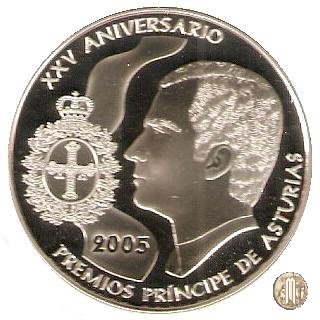 Verso: In primo piano profilo volto a sinistra del Principe D. Filippo e a sinistra lo scudo del Principe delle Asturie, sotto l'anno di emissione, nel giro il alto una parte della legenda XXV ANIVERSARIO e in basso la seconda parte PREMIOS PRÍNCIPE DE ASTURIAS.