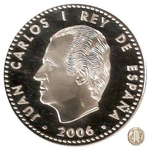 Verso: La moneta è suddivisa in due metà: in parte alta una mappa dell'Europa con in alto in circolo la legenda ADHESION A LAS COMUNIDADES EUROPEAS , al centro le date 1896-2006 e a destra il segno di zecca; nella parte bassa mostra l'immagine di un ponte che rappresenta il reddito di entrambi i paesi della Comunità europea, sulla carreggiata del ponte la legenda ESPAGÑA-PORTUGAL e sotto completa la moneta il valore nominale.