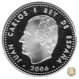 Verso: Sullo sfondo la rete di una porta di calcio, in primo piano il braccio del portiere che si allunga per prendere la palla, stilizzata e finemente rigata la scia della palla mostra l'immagine della mappa della Spagna continentale e un campo di calcio visto dall'alto, sulla destra il valore nominale e il simbolo di zecca, nel giro nella parte alta la legenda COPA MUNDIAL DE LA FIFA, e sotto ALEMANIA 2006, per completare il giro tra le due scritte due serie di perle.