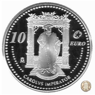 Verso: Immagine dell'imperatore Carlo V, dal manoscritto dell'Ordine del Toson d'Oro, che è conservato presso l'Instituto de Valencia de Don Juan a Madrid, sinistra il valore nominale, a destra la legenda EURO e il logo dell'UE Eurostar, in basso e in circolo la legenda CAROLVS IMPERATOR, dal centro/sinistra al centro/destra interrotta dalla legenda posta in basso un giro di perle, un secondo giro di perle contorna tutta la moneta.