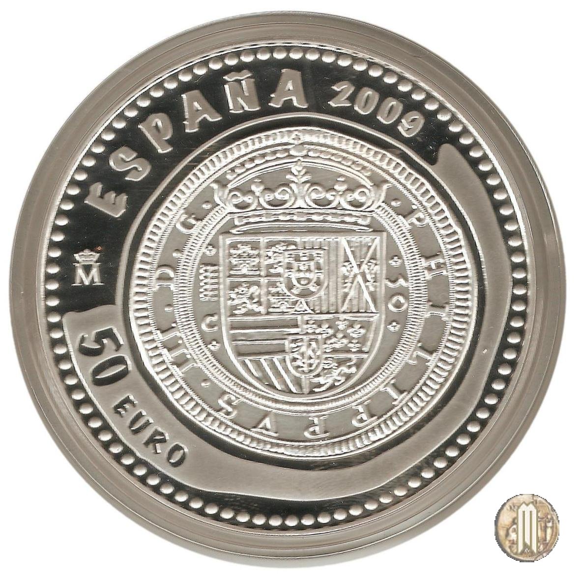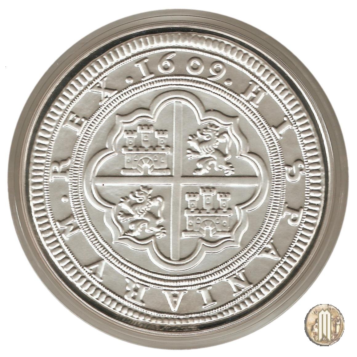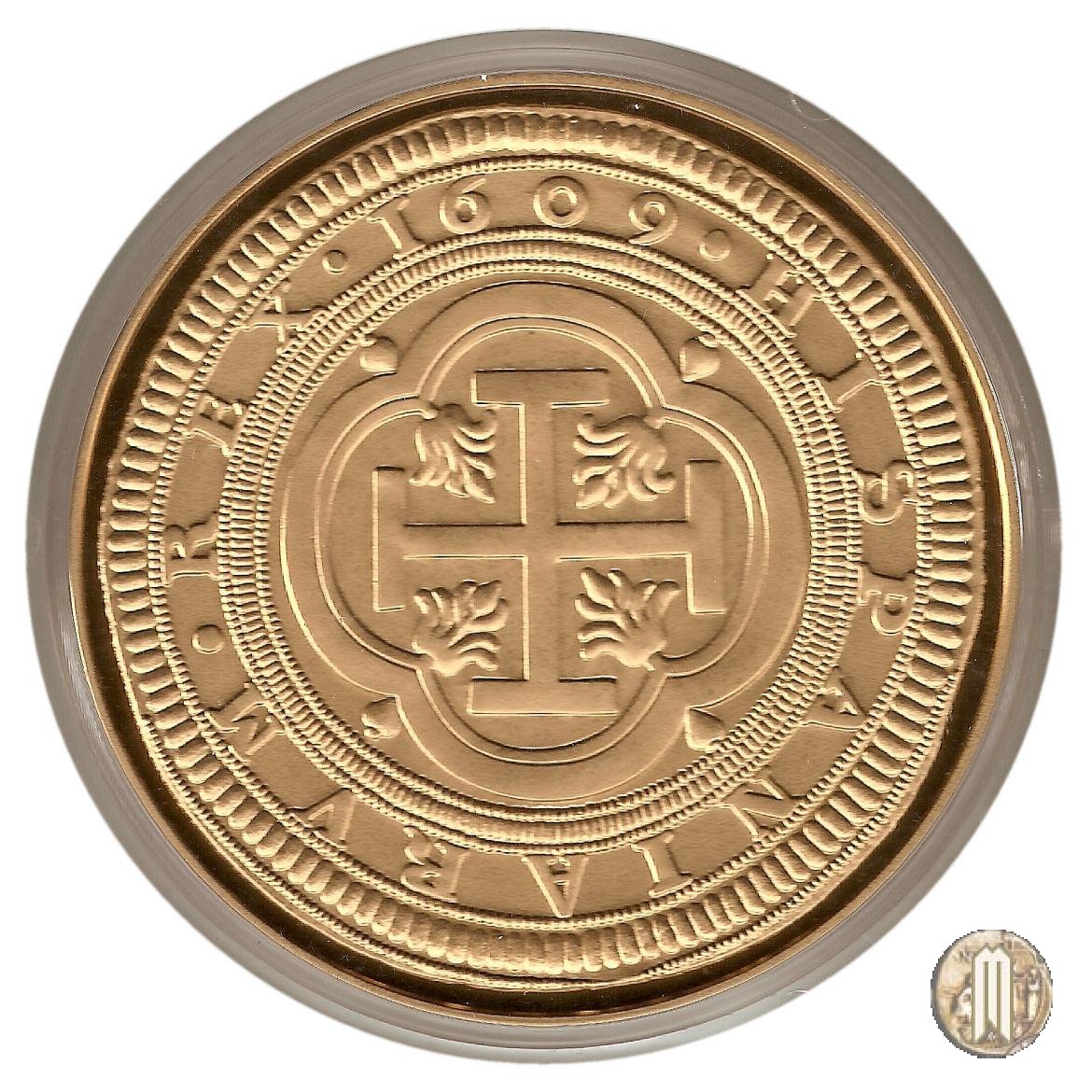 Verso: Riproduzione dell'altra faccia della moneta da 100 scudi, rilasciata nel 1609 sotto il regno di Filippo III (sul giro la legenda 1609 HISPAGNARVMREX, sul bordo una serie di perle ovali).