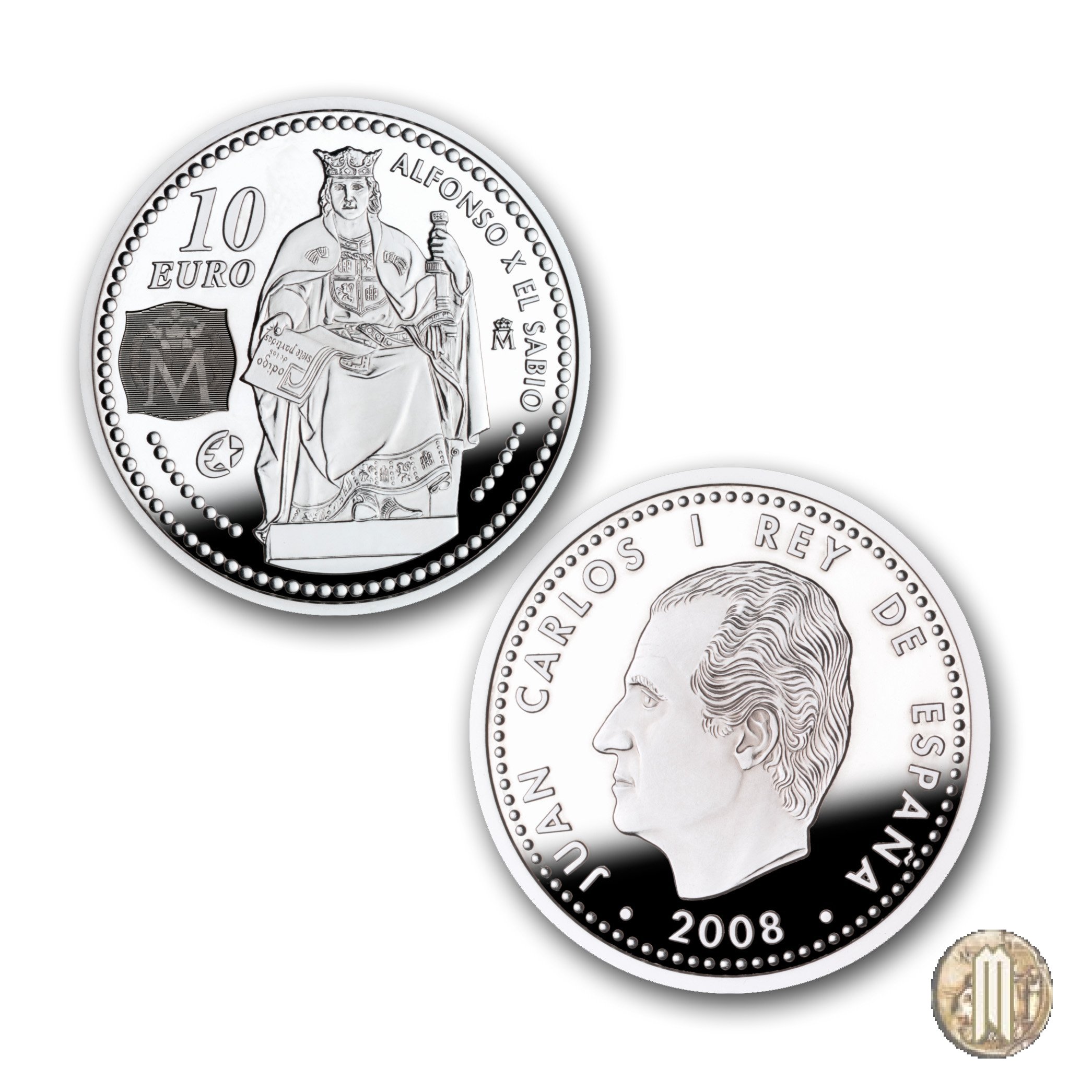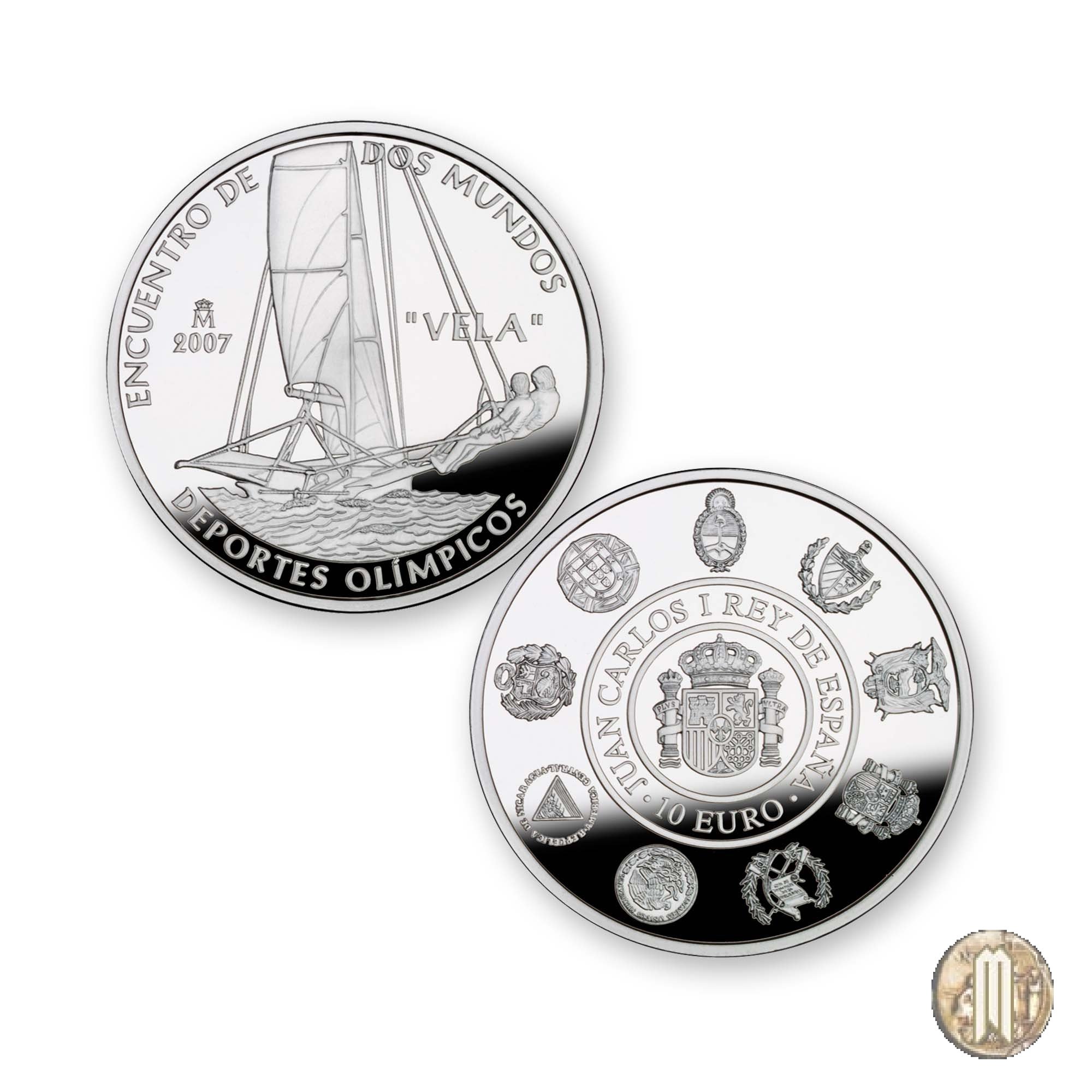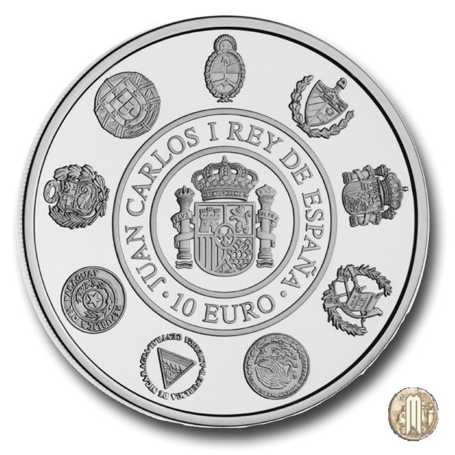 Dritto: Al centro lo scudo costituzionale della Spagna, un interno giro con la leggenda JUAN CARLOS I REY DE ESPAGÑA 10 EURO, contorna il giro nove scudi uno per ogni stato partecipante.