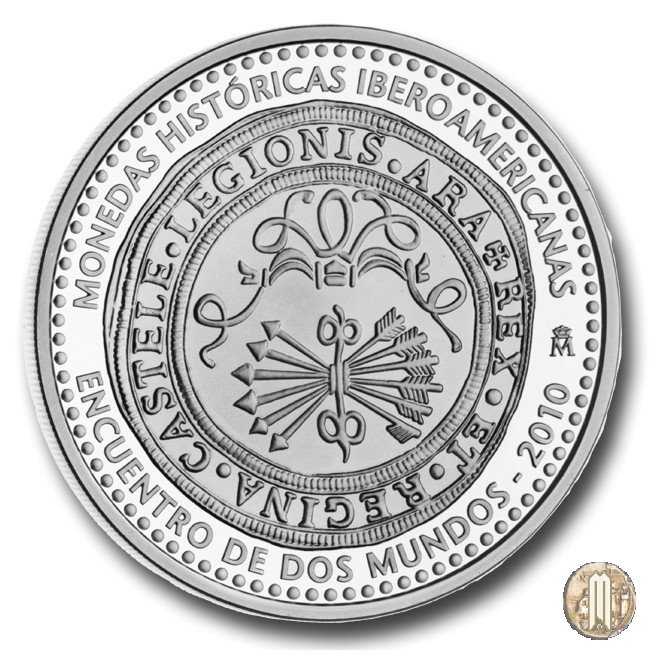 Verso: Riproduzione della parte posteriore di un pezzo di 8 reales coniato a Siviglia per conto dei Re Cattolici; sul giro in alto la legenda MONEDAS HISTÓRICAS IBEROAMERICANAS, in basso la legenda ENCUENTRO DE DOS MUNDOS - 2010, a destra il simbolo di zecca; bordo finemente perlato.