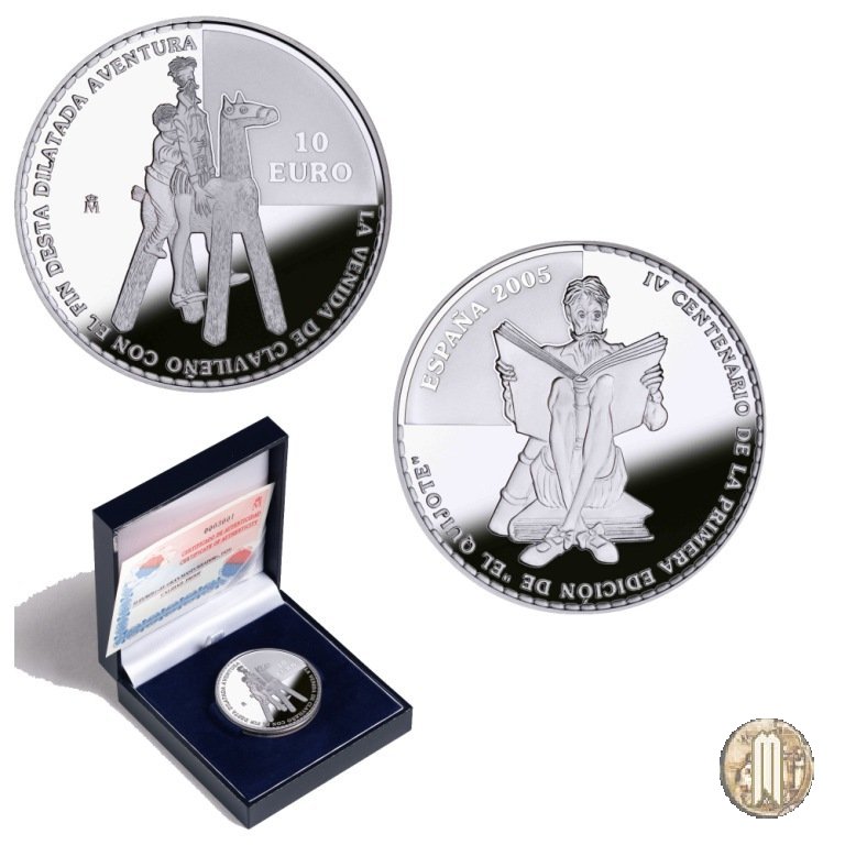Verso: E' riprodotta l'immagine di Don Chisciotte seduto su una pila di libri e in mano una spada, a destra il simbolo di zecca, a sinistra il valore nominale e le date 1605-2005, in alto in un cerchio finemente rigato troviamo la M coronata, in basso e in circolo la legenda IV CENTENARIO DE LA PRIMERA EDICIÓN DE "EL QUIJOTE", contorna il tutto una serie di perle.
