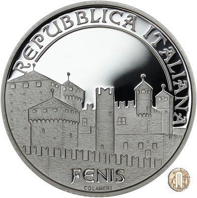 10 Euro 2013 Italia delle Arti - Fenis Dritto: Castello di Fenis in Valle d'Aosta; nel giro, "REPUBBLICA ITALIANA", in esergo "FENIS" "COLANERI". Verso: Affresco con San Giorgio e il drago, posto sullo sfondo dello scalone del cortile interno del Castello di Fenis (Valle d'Aosta); nel giro "ITALIA" "DELLE ARTI"; nel campo, "2013" "R"; in basso a destra "10" "EURO". | |