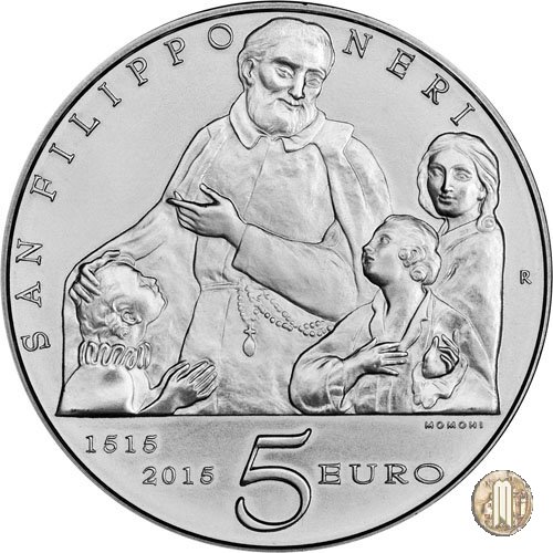 5 Euro 2015 500° Anniversario della Nascita di San Filippo Neri Dritto: Particolare del dipinto San Filippo Neri in preghiera realizzato dalla bottega di Giovanni Francesco Barbieri detto il Guercino (1591-1666), custodito nella Pinacoteca Nazionale di Bologna; in giro, la scritta «REPUBBLICA ITALIANA». Verso: Raffigurazione di un particolare dell'affresco San Filippo Neri tra i discepoli, di autore anonimo, conservato presso il Battistero Lateranense di Roma; in esergo, le date «1515 2015», rispettivamente anno di anniversario e di emissione, ed il valore «5 EURO»; alla base dell'opera, il nome dell'autore «MOMONI»; nel campo di destra, «R», identificativo della Zecca di Roma; ad arco, nella parte superiore, la scritta «SAN FILIPPO NERI». | |