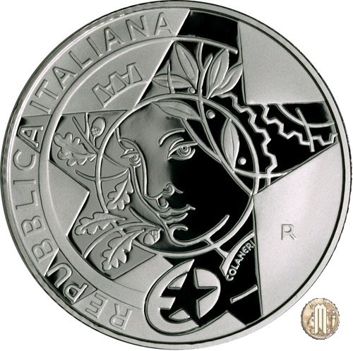 10 Euro 2015 70 Anni di Pace in Europa Dritto: Una colomba, simbolo di pace, è sorretta da una figura femminile, allegoria dell'Europa, con il numero «70», indicativo dell'anniversario della pace, e le stelle dell'Unione Europea tra i capelli; un ramo d'ulivo, che delimita a destra il logo di Europa Star Programme, suggella la rappresentazione; ad arco, la scritta «REPUBBLICA ITALIANA»; a seguire, il nome dell'autore «COLANERI». Verso: La Pace semisdraiata, di tre quarti, con ramo di ulivo nella mano sinistra: particolare dell'affresco realizzato da Ambrogio Lorenzetti sul tema del Buon Governo per la Sala dei Nove nel Palazzo Pubblico di Siena; a destra, colomba stilizzata e le stelle dell'Unione Europea; in alto il valore «10 EURO»; nel campo di sinistra, «R», identificativo della Zecca di Roma, e le date «1945 2015», rispettivamente anno di anniversario e di emissione; in basso, ad arco, la scritta «70 ANNI DI PACE IN EUROPA». | |